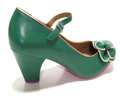 This vintage inspired Cristofoli Shoe is both timeless and elegant. This beautiful shoe is in a lovely green leather, with contrast piping in rose gold, sweet flower detail with rose gold embroidered edging and adjustable ankle strap. It’s a fun twist to the classic pump.