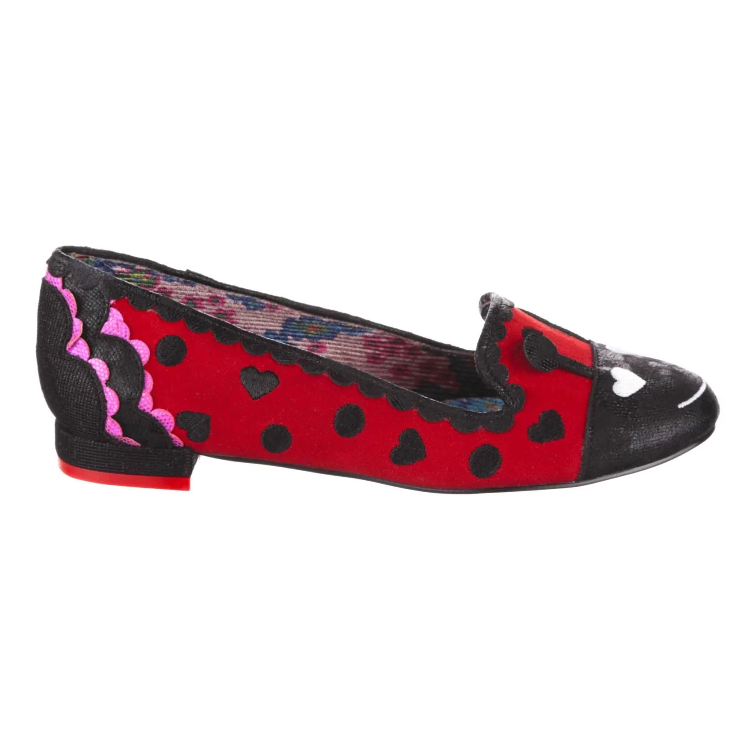 Aren’t these so cute?! These ladybug flats are made of red suedette, and have a cute little bug face on the toe! Spots and hearts are embroidered along the length of the shoe, and pink and black scalloped details decorate the heel of the shoe. The antenna of the ladybug can lie flat, or sit up for more impact! Catch them today, before they fly away!