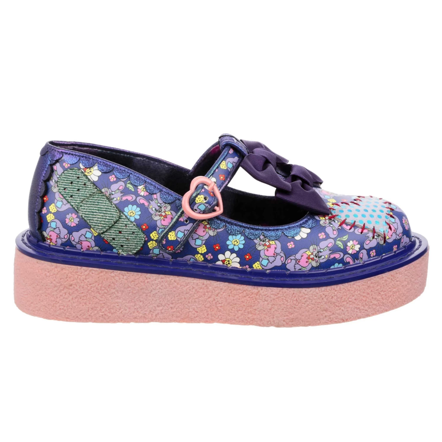 Patched up and pretty, these super cute platform T-Bars are here to give your look some edge! Super cute purple bows are dotted along the middle strap, and applique of sparkly plasters and stitch hearts are dotted around the blue printed upper! What are you waiting for? Pop them on and get strutting!