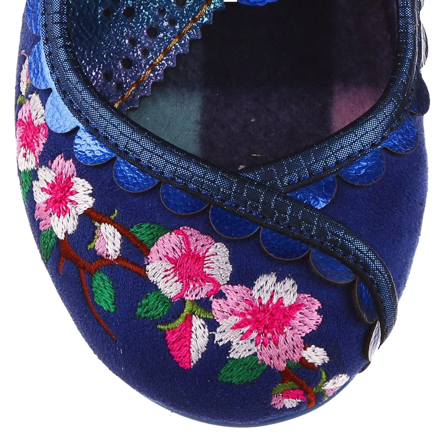 Beautiful pink Cherry Blossom embroidery adorns these gorgeous shoes over top of a dark blue mock suede finish. Beautiful metallic scalloping adds detail, finished with a blue knot clasp and glitter heel. These shoes are simply stunning!