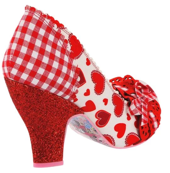 Can you feel the love in the air? These adorable heels are sure to make your heart thump! A fabulous and romantic white and red heart print fabric is paired with matching gingham for a truly dreamy shoe! The heel is encrusted in bright red glitter, which matches the stunning red lacey detail on the toe! Topped off with a delicate gingham bow, and cute scalloped edges – these lovelies are not to be missed!
