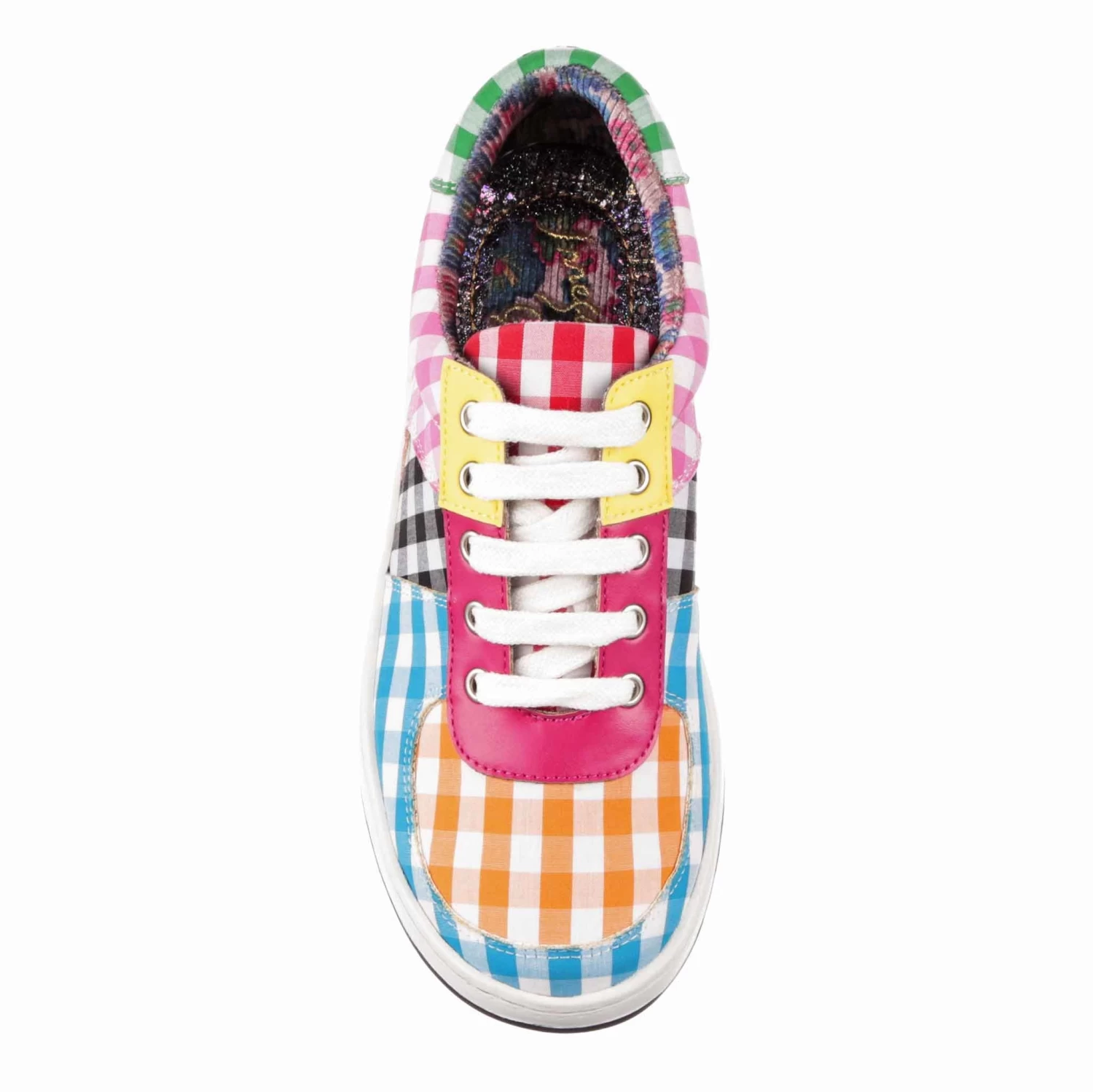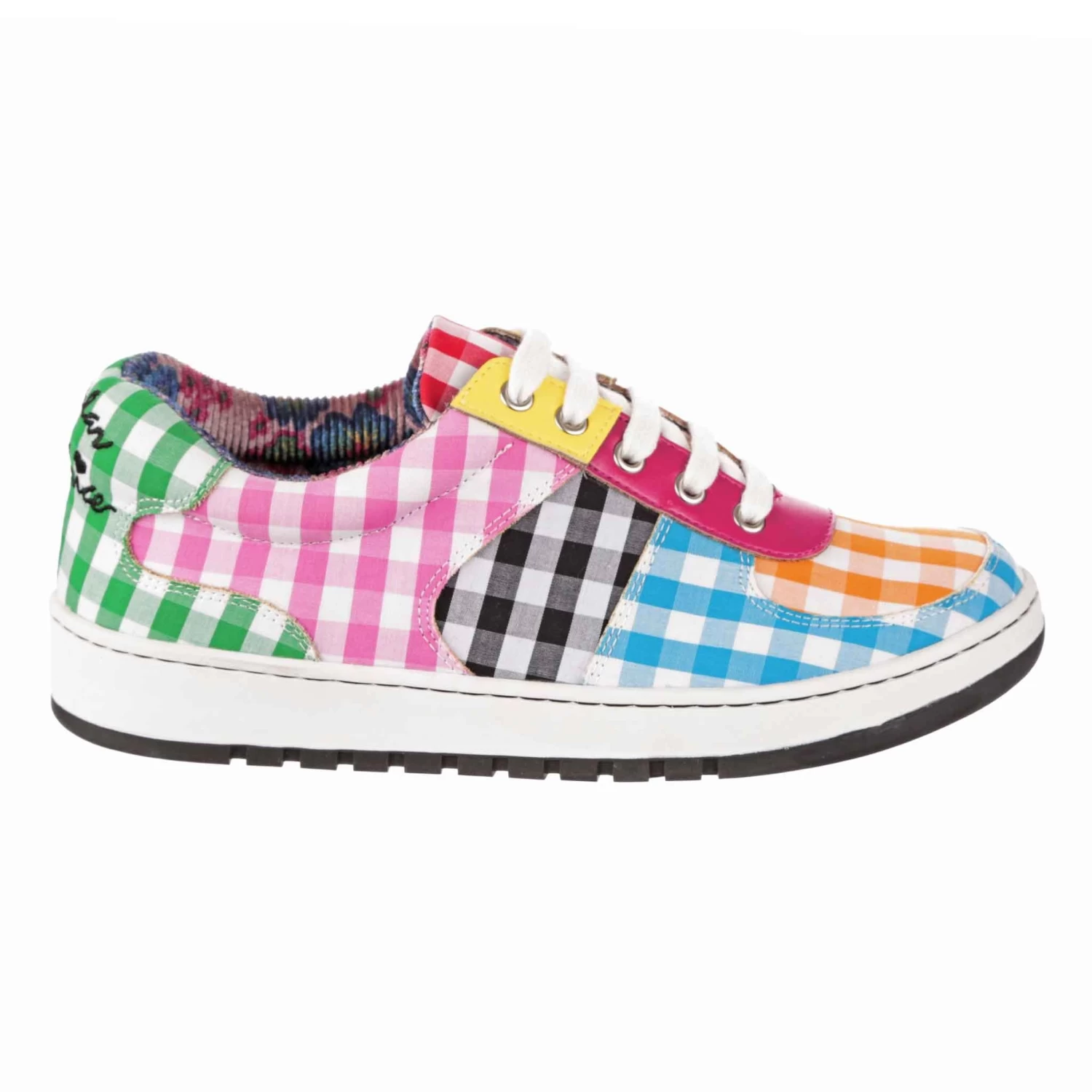 These colourful trainers are stunners! Covered from tip to toe in mismatched colourful gingham, in shades of blue, orange, black, pink, red, and green. Finished with thick black and white soles and white laces. Feel bold and beautiful in these sneakers!