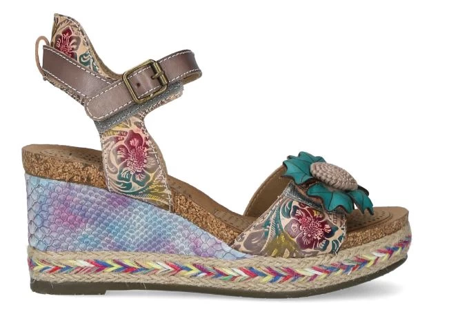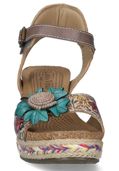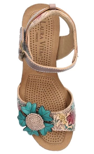 Beautiful Wedges by Laura Vita France, perfect for the warmer weather. These great wedges are as practical as they are gorgeous, with their adjustable ankle strap and adjustable placement over the top of the foot to fit any width. They are adorned with a super sweet flower that adds a fun little twist!