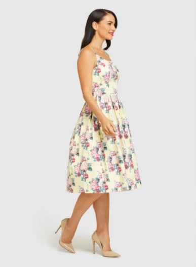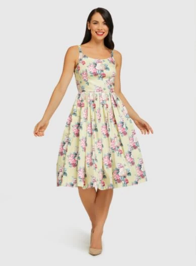 Oh so pretty! Beautiful Vintage inspired dress in beautiful lemon with floral details. This gorgeous dress has wide adjustable straps and a double pleated skirt with side seam pockets.