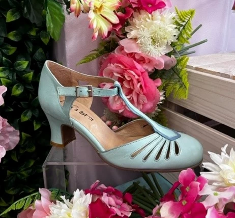 These Beautiful vintage inspired mid heels are in the softest leather that is just heaven on your feet! This pair is in a vibrant soft green blue leather with a soft blue piping.